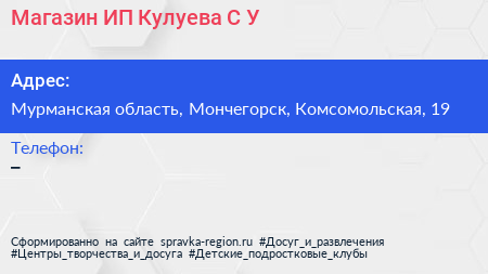 Магазин, ИП Кулуева С.У. по адресу Мурманская область, Мончегорск, Комсомольская, 19 в дальнейшем Организация, размещена в следующих категориях: