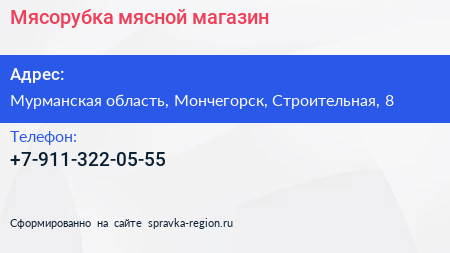 Мясорубка, мясной магазин по адресу Мурманская область, Мончегорск, Строительная, 8 в дальнейшем Организация, размещена в следующих категориях: