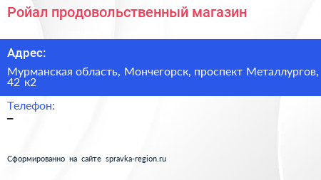 Ройал, продовольственный магазин по адресу Мурманская область, Мончегорск, проспект Металлургов, 42 к2 в дальнейшем Организация, размещена в следующих категориях: