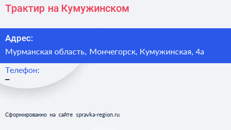 Трактир на Кумужинском по адресу Мурманская область, Мончегорск, Кумужинская, 4а в дальнейшем Организация, размещена в следующих категориях: