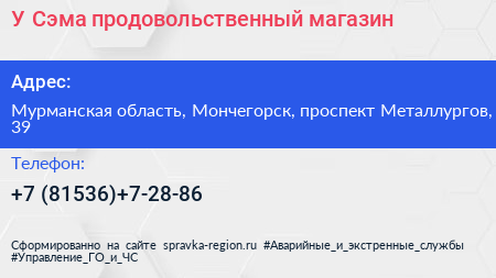 У Сэма, продовольственный магазин по адресу Мурманская область, Мончегорск, проспект Металлургов, 39 в дальнейшем Организация, размещена в следующих категориях: