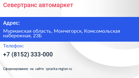 Севертранс, автомаркет по адресу Мурманская область, Мончегорск, Комсомольская набережная, 23Б в дальнейшем Организация, размещена в следующих категориях: