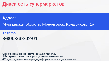 Дикси, сеть супермаркетов по адресу Мурманская область, Мончегорск, Кондрикова, 16 в дальнейшем Организация, размещена в следующих категориях: