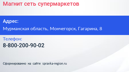 Магнит, сеть супермаркетов по адресу Мурманская область, Мончегорск, Гагарина, 8 в дальнейшем Организация, размещена в следующих категориях: