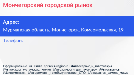 Мончегорский городской рынок по адресу Мурманская область, Мончегорск, Комсомольская, 19 в дальнейшем Организация, размещена в следующих категориях: