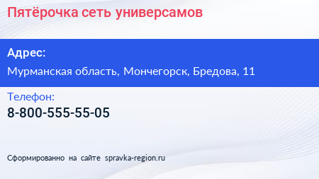 Пятёрочка, сеть универсамов по адресу Мурманская область, Мончегорск, Бредова, 11 в дальнейшем Организация, размещена в следующих категориях: