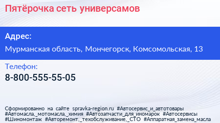 Пятёрочка, сеть универсамов по адресу Мурманская область, Мончегорск, Комсомольская, 13 в дальнейшем Организация, размещена в следующих категориях: