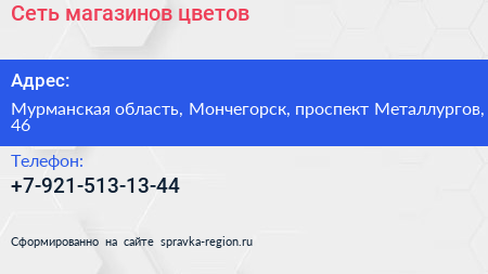 Сеть магазинов цветов по адресу Мурманская область, Мончегорск, проспект Металлургов, 46 в дальнейшем Организация, размещена в следующих категориях:
