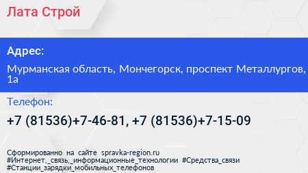 Лата-Строй по адресу Мурманская область, Мончегорск, проспект Металлургов, 1а в дальнейшем Организация, размещена в следующих категориях: