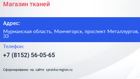 Магазин тканей по адресу Мурманская область, Мончегорск, проспект Металлургов, 33 в дальнейшем Организация, размещена в следующих категориях: