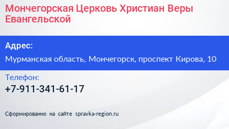 Мончегорская Церковь Христиан Веры Евангельской по адресу Мурманская область, Мончегорск, проспект Кирова, 10 в дальнейшем Организация, размещена в следующих категориях: