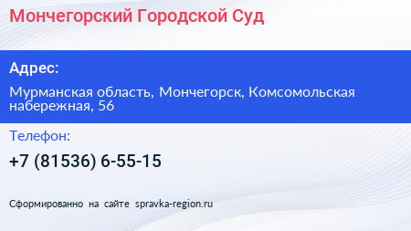 Мончегорский Городской Суд по адресу Мурманская область, Мончегорск, Комсомольская набережная, 56 в дальнейшем Организация, размещена в следующих категориях: