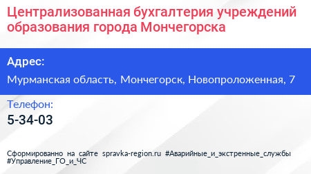 Централизованная бухгалтерия учреждений образования города Мончегорска по адресу Мурманская область, Мончегорск, Новопроложенная, 7 в дальнейшем Организация, размещена в следующих категориях:
