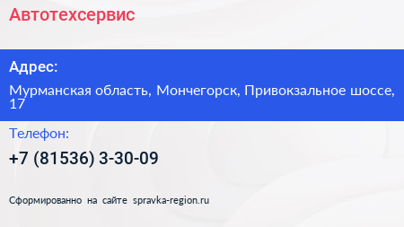 Автотехсервис по адресу Мурманская область, Мончегорск, Привокзальное шоссе, 17 в дальнейшем Организация, размещена в следующих категориях: