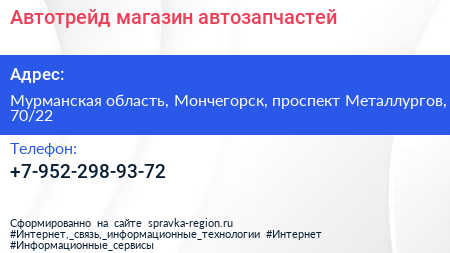 Автотрейд, магазин автозапчастей по адресу Мурманская область, Мончегорск, проспект Металлургов, 70/22 в дальнейшем Организация, размещена в следующих категориях: