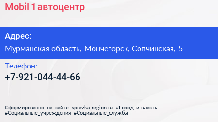 Mobil 1, автоцентр по адресу Мурманская область, Мончегорск, Сопчинская, 5 в дальнейшем Организация, размещена в следующих категориях: