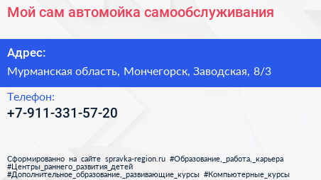 Мой сам, автомойка самообслуживания по адресу Мурманская область, Мончегорск, Заводская, 8/3 в дальнейшем Организация, размещена в следующих категориях: