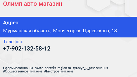 Олимп-авто, магазин по адресу Мурманская область, Мончегорск, Царевского, 18 в дальнейшем Организация, размещена в следующих категориях: