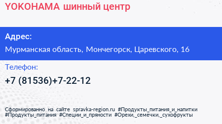 YOKOHAMA, шинный центр по адресу Мурманская область, Мончегорск, Царевского, 16 в дальнейшем Организация, размещена в следующих категориях:
