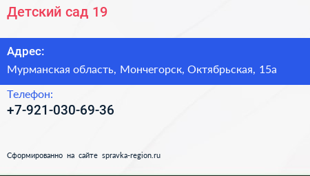 Детский сад №19 по адресу Мурманская область, Мончегорск, Октябрьская, 15а в дальнейшем Организация, размещена в следующих категориях: