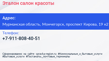 Эталон, салон красоты по адресу Мурманская область, Мончегорск, проспект Кирова, 19 к2 в дальнейшем Организация, размещена в следующих категориях: