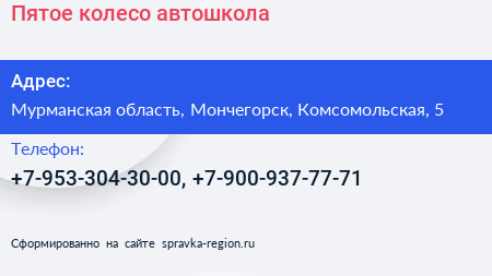 Пятое колесо, автошкола по адресу Мурманская область, Мончегорск, Комсомольская, 5 в дальнейшем Организация, размещена в следующих категориях: