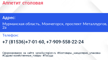 Аппетит, столовая по адресу Мурманская область, Мончегорск, проспект Металлургов, 2а в дальнейшем Организация, размещена в следующих категориях: