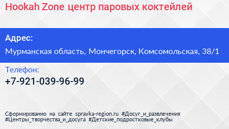 Hookah Zone, центр паровых коктейлей по адресу Мурманская область, Мончегорск, Комсомольская, 38/1 в дальнейшем Организация, размещена в следующих категориях: