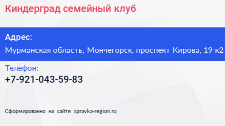 Киндерград, семейный клуб по адресу Мурманская область, Мончегорск, проспект Кирова, 19 к2 в дальнейшем Организация, размещена в следующих категориях: