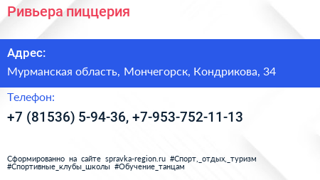 Ривьера, пиццерия по адресу Мурманская область, Мончегорск, Кондрикова, 34 в дальнейшем Организация, размещена в следующих категориях: