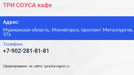 ТРИ СОУСА, кафе по адресу Мурманская область, Мончегорск, проспект Металлургов, 37а в дальнейшем Организация, размещена в следующих категориях: