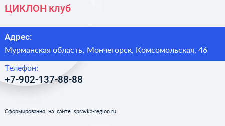 ЦИКЛОН, клуб по адресу Мурманская область, Мончегорск, Комсомольская, 46 в дальнейшем Организация, размещена в следующих категориях: