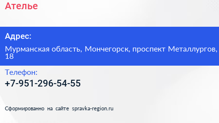 Ателье по адресу Мурманская область, Мончегорск, проспект Металлургов, 18 в дальнейшем Организация, размещена в следующих категориях: