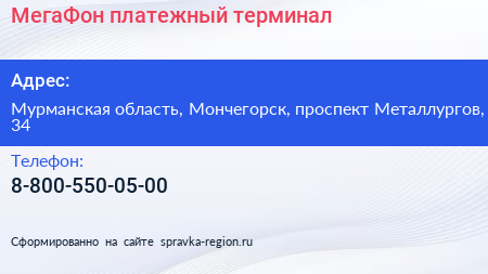 МегаФон, платежный терминал по адресу Мурманская область, Мончегорск, проспект Металлургов, 34 в дальнейшем Организация, размещена в следующих категориях: