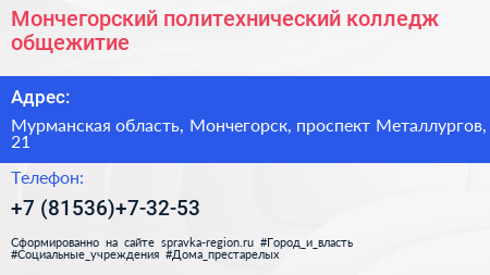 Мончегорский политехнический колледж, общежитие по адресу Мурманская область, Мончегорск, проспект Металлургов, 21 в дальнейшем Организация, размещена в следующих категориях: