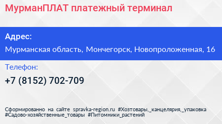 МурманПЛАТ, платежный терминал по адресу Мурманская область, Мончегорск, Новопроложенная, 16 в дальнейшем Организация, размещена в следующих категориях: