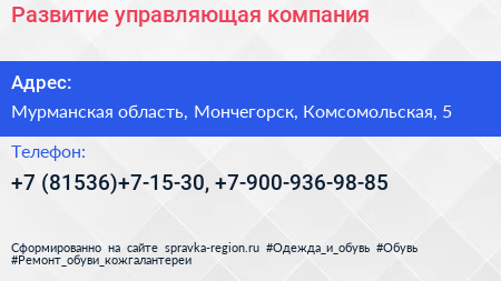 Развитие, управляющая компания по адресу Мурманская область, Мончегорск, Комсомольская, 5 в дальнейшем Организация, размещена в следующих категориях: