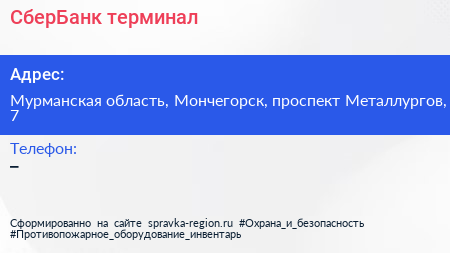 СберБанк, терминал по адресу Мурманская область, Мончегорск, проспект Металлургов, 7 в дальнейшем Организация, размещена в следующих категориях: