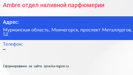 Ambre, отдел наливной парфюмерии по адресу Мурманская область, Мончегорск, проспект Металлургов, 52 в дальнейшем Организация, размещена в следующих категориях: