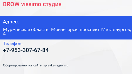 BROW`vissimo, студия по адресу Мурманская область, Мончегорск, проспект Металлургов, 4 в дальнейшем Организация, размещена в следующих категориях: