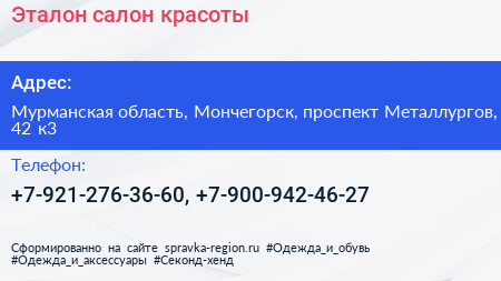 Эталон, салон красоты по адресу Мурманская область, Мончегорск, проспект Металлургов, 42 к3 в дальнейшем Организация, размещена в следующих категориях: