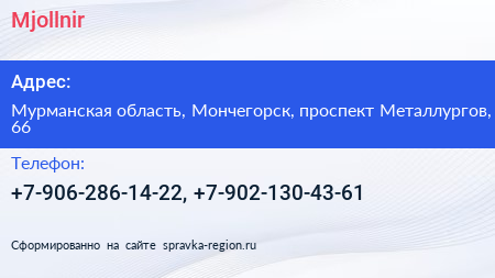 Mjollnir по адресу Мурманская область, Мончегорск, проспект Металлургов, 66 в дальнейшем Организация, размещена в следующих категориях: