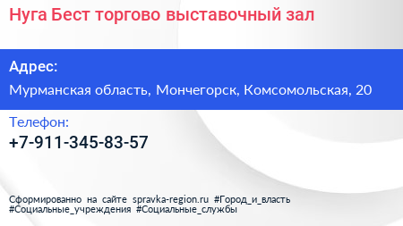 Нуга Бест, торгово-выставочный зал по адресу Мурманская область, Мончегорск, Комсомольская, 20 в дальнейшем Организация, размещена в следующих категориях: