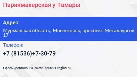 Парикмахерская у Тамары по адресу Мурманская область, Мончегорск, проспект Металлургов, 17 в дальнейшем Организация, размещена в следующих категориях: