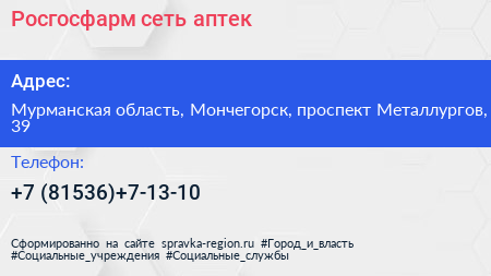 Росгосфарм, сеть аптек по адресу Мурманская область, Мончегорск, проспект Металлургов, 39 в дальнейшем Организация, размещена в следующих категориях: