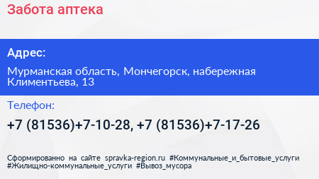 Забота, аптека по адресу Мурманская область, Мончегорск, набережная Климентьева, 13 в дальнейшем Организация, размещена в следующих категориях: