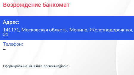 Возрождение, банкомат по адресу 141171, Московская область, Монино, Железнодорожная, 31 в дальнейшем Организация, размещена в следующих категориях: