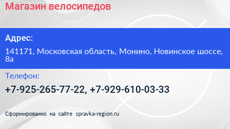 Магазин велосипедов по адресу 141171, Московская область, Монино, Новинское шоссе, 8а в дальнейшем Организация, размещена в следующих категориях: