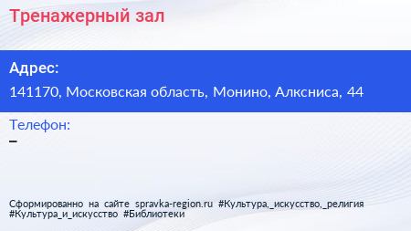 Тренажерный зал по адресу 141170, Московская область, Монино, Алксниса, 44 в дальнейшем Организация, размещена в следующих категориях: