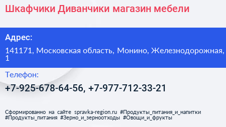 Шкафчики-Диванчики, магазин мебели по адресу 141171, Московская область, Монино, Железнодорожная, 1 в дальнейшем Организация, размещена в следующих категориях: